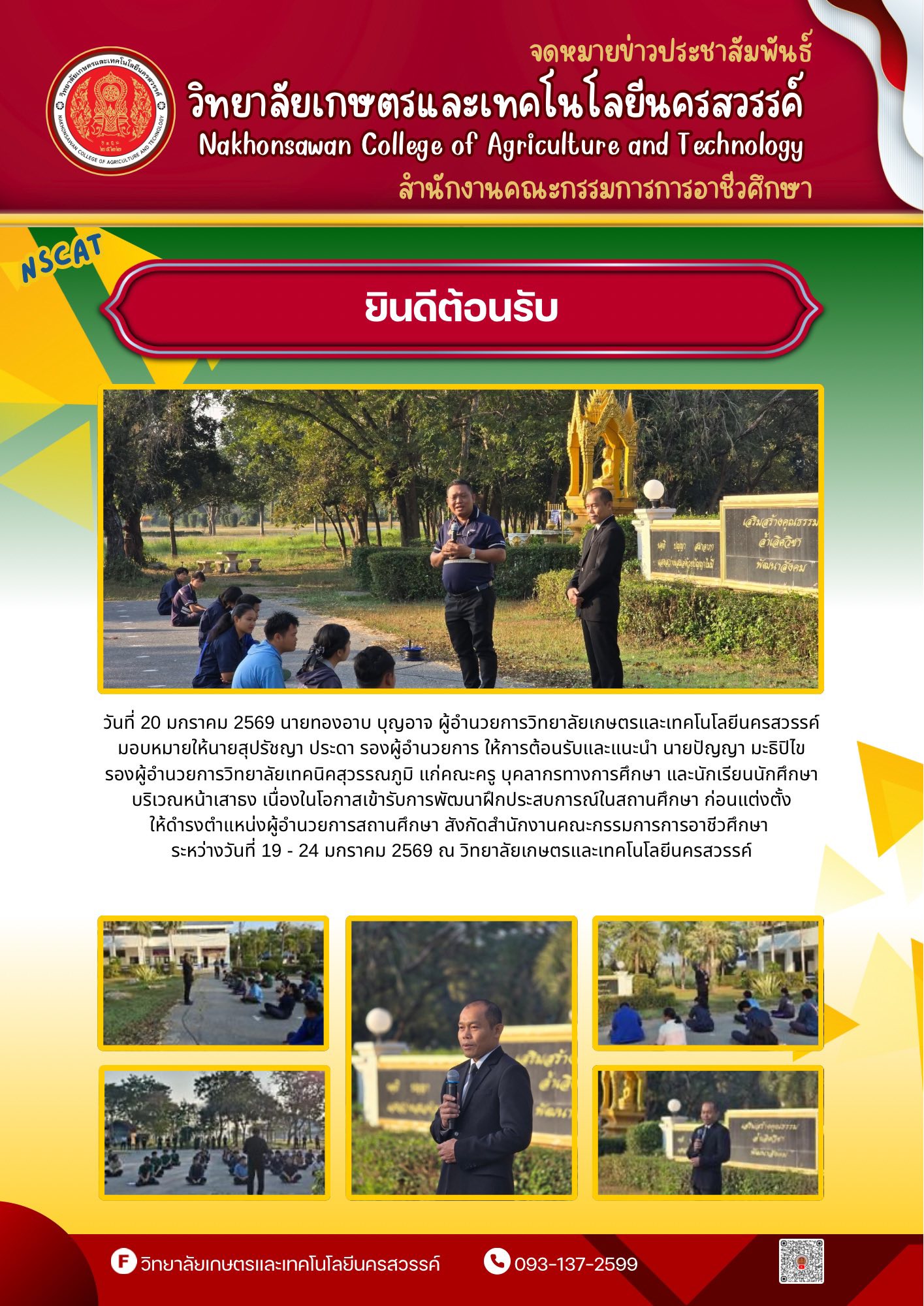 วันที่ 26 มกราคม 2569นายทองอาบ บุญอาจ ผู้อำนวยการวิทยาลัยเกษตรและเทคโนโลยีนครสวรรค์ ให้การต้อนรับและแนะนำ นายไพฑูรย์ สุขผลานันท์ รองผู้อำนวยการ วิทยาลัยเทคนิคจันทบุรี แก่คณะผู้บริหาร ครู บุคลากรทางการศึกษา และนักเรียนนักศึกษา