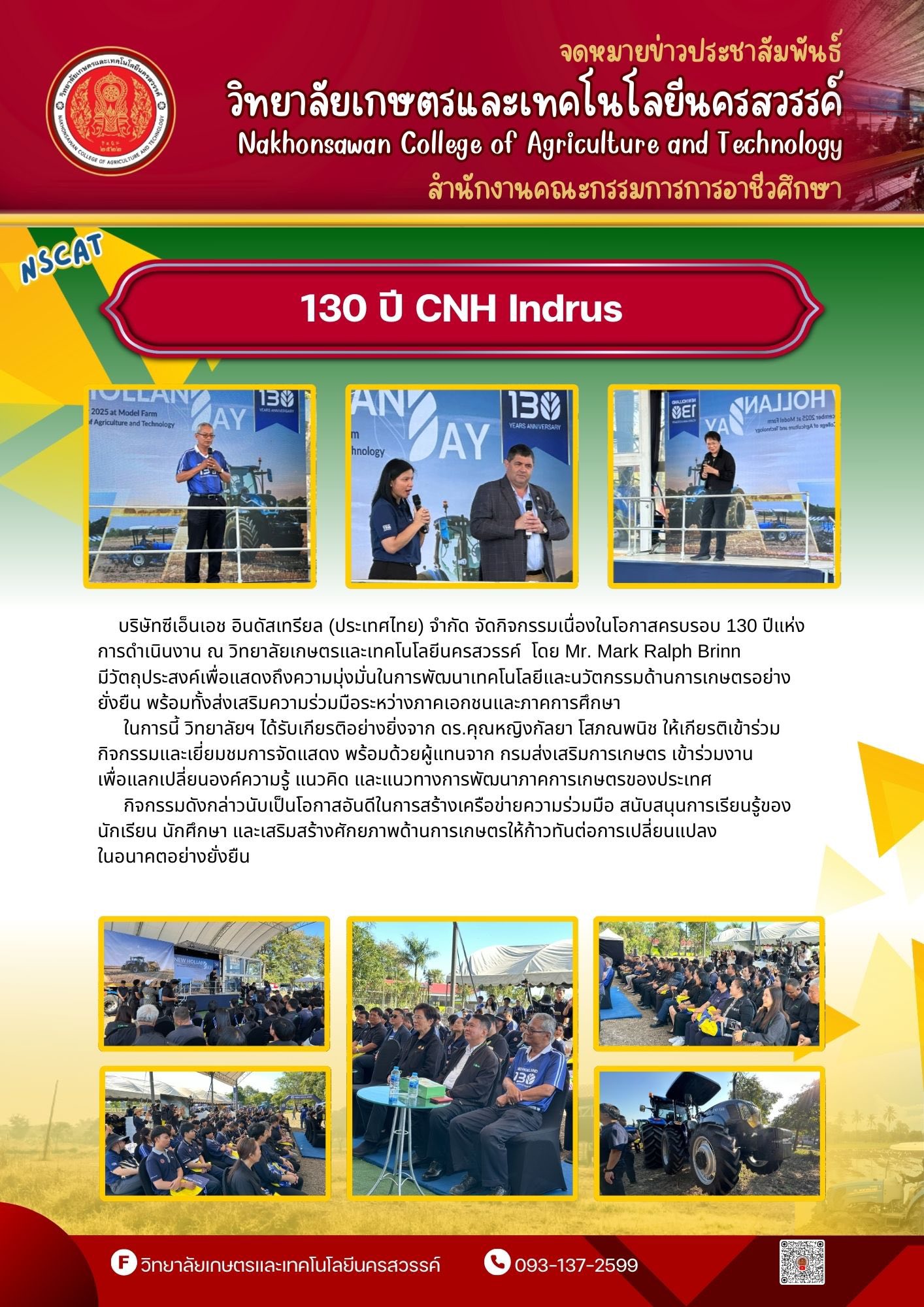บริษัทซีเอ็นเอช อินดัสเทรียล (ประเทศไทย) จำกัด จัดกิจกรรมเนื่องในโอกาสครบรอบ 130 ปีแห่งการดำเนินงาน ณ วิทยาลัยเกษตรและเทคโนโลยีนครสวรรค์ โดย Mr. Mark Ralph Brinn เพิ่มเติม