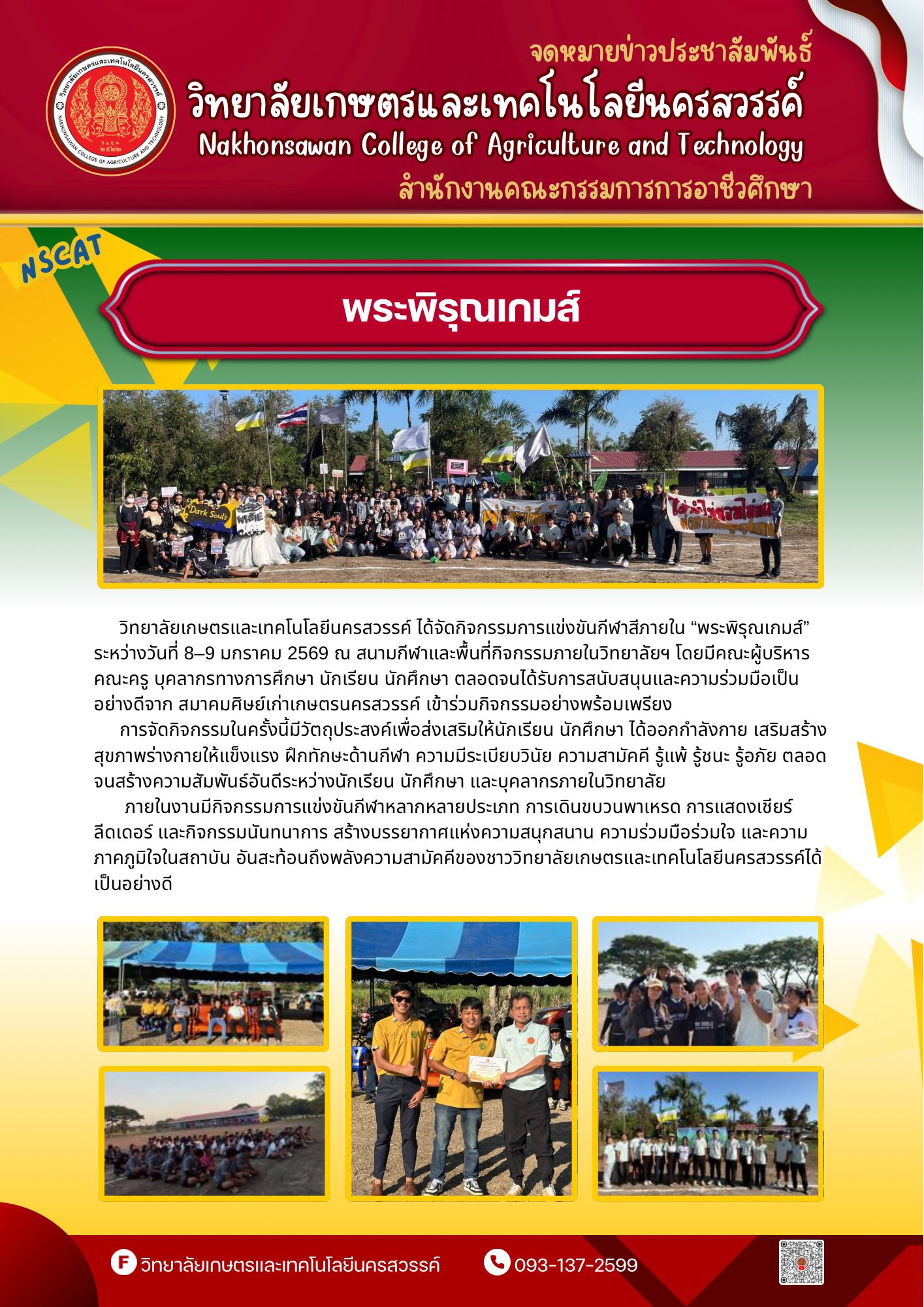 วิทยาลัยเกษตรและเทคโนโลยีนครสวรรค์ ได้จัดกิจกรรมการแข่งขันกีฬาสีภายใน “พระพิรุณเกมส์” ระหว่างวันที่ 8–9 มกราคม 2569 ณ สนามกีฬาและพื้นที่กิจกรรมภายในวิทยาลัยฯ โดยมีคณะผู้บริหาร คณะครู บุคลากรทางการศึกษา นักเรียน นักศึกษา ตลอดจนได้รับการสนับสนุนและความร่วมมือเป็นอย่างดีจาก สมาคมศิษย์เก่าเกษตรนครสวรรค์ เข้าร่วมกิจกรรมอย่างพร้อมเพรียง เพิ่มเติม