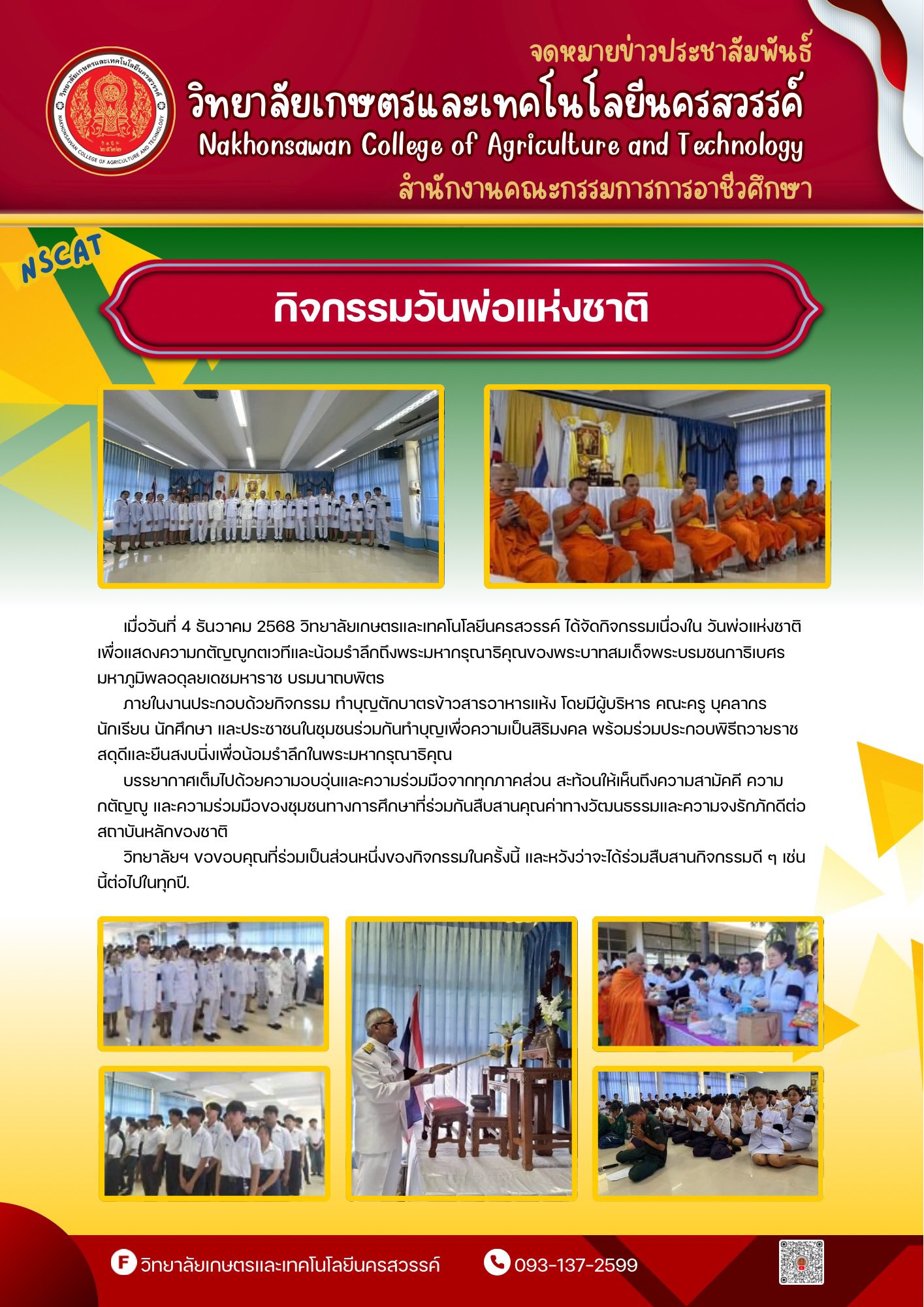 เมื่อวันที่ 4 ธันวาคม 2568 วิทยาลัยเกษตรและเทคโนโลยีนครสวรรค์ ได้จัดกิจกรรมเนื่องใน วันพ่อแห่งชาติ เพื่อแสดงความกตัญญูกตเวทีและน้อมรำลึกถึงพระมหากรุณาธิคุณของพระบาทสมเด็จพระบรมชนกาธิเบศร มหาภูมิพลอดุลยเดชมหาราช บรมนาถบพิตร เพิ่มเติม